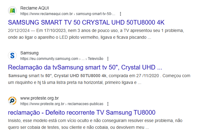 Com uma simples pesquisa por esse modelo de televisão, é possível encontrar diversas reclamações, tanto no site “Reclame Aqui”, quanto no próprio site da empresa.